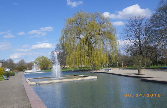Die sich gleichmäßig verteilt an der Nordseite der sog. Wasserachse, einer 150 m langen, künstlichen Wasserfläche bifindlichen bereits 1950 errichteten Brunnentassen waren in die Jahre gekommen. Für eine erfolgreiche Sanierung waren u. a. Kenntnisse zur Ausbildung des Unterbaus und des Untergrundes erforderlich.
